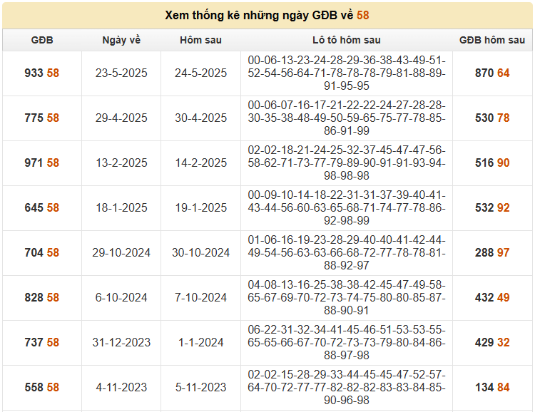 Dựa vào bảng thống kê các lần GĐB về 58, có thể rút ra một vài xu hướng đáng chú ý để tham khảo: